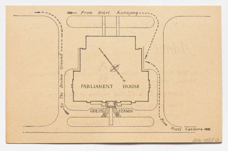 This handy leather souvenir wallet containing a first-class rail pass as well as tickets to the opening of Parliament House and the associated events was issued to Mrs Ethel Bruce, wife of Prime Minister Stanley Melbourne Bruce and a member of the official party.
