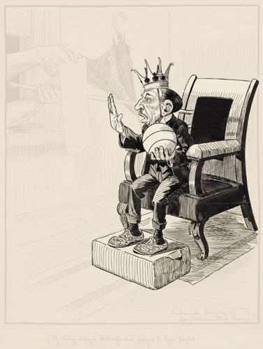 Claude Marquet drew this cartoon in 1916. The cartoon refers to Billy Hughes's political past. Billy Hughes was first elected to Federal Parliament in 1901 as a prominent Labor Party member after ten years as a Labor MP in NSW. He became prime minister in October 1915, during the First World War.