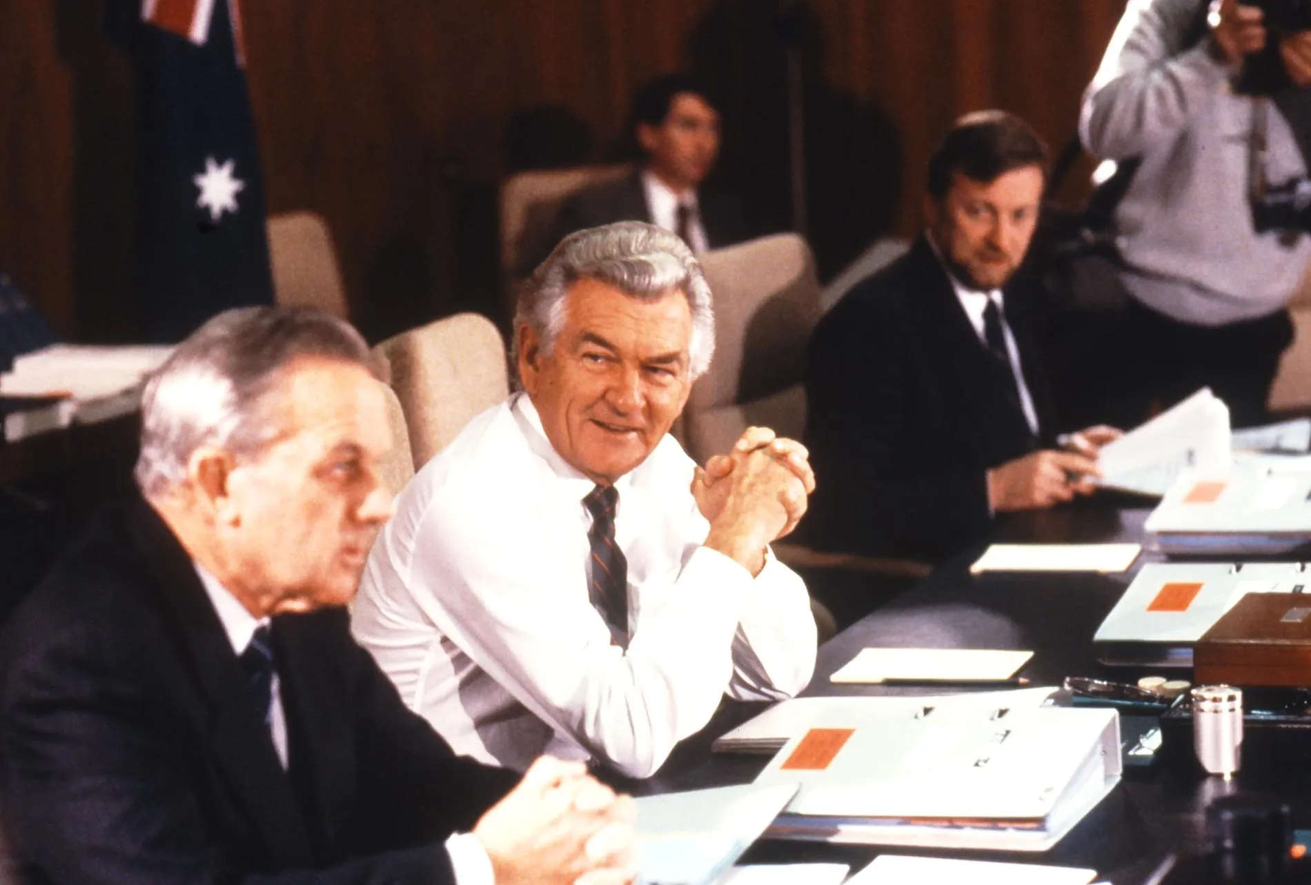 L to R: Deputy Prime Minister Lionel Bowen, Prime Minister Bob Hawke and Minister for Transport and Communications Gareth Evans in the Cabinet Room in 1988. Photograph by Robert McFarlane, Department of the House of Representatives
