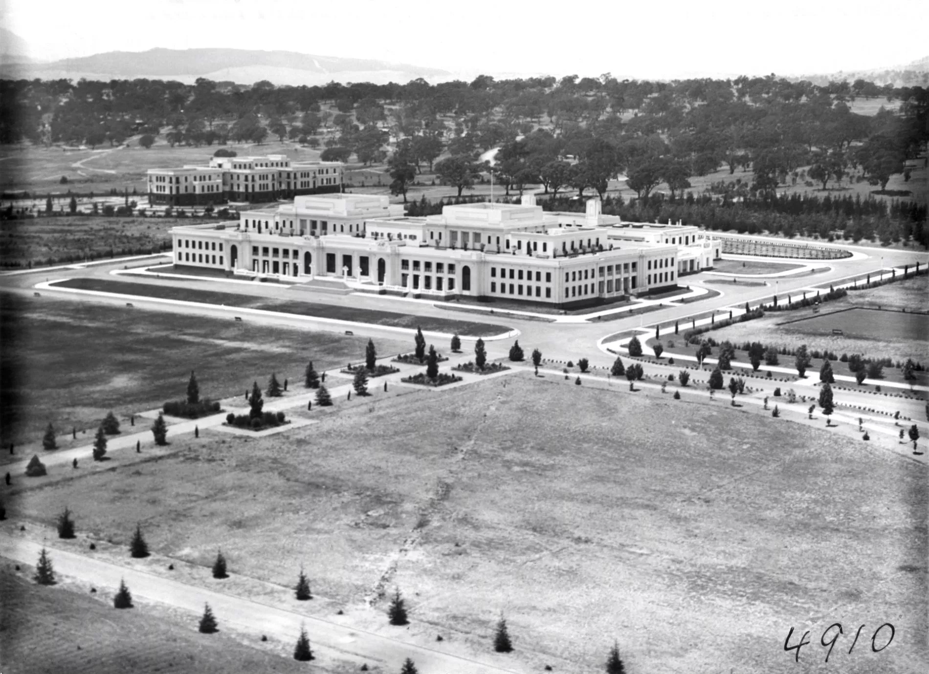 Aerial view of Parliament House in 1928 showing the beginnings of the formal gardens. Photograph National Archives of Australia: A3560, 4910